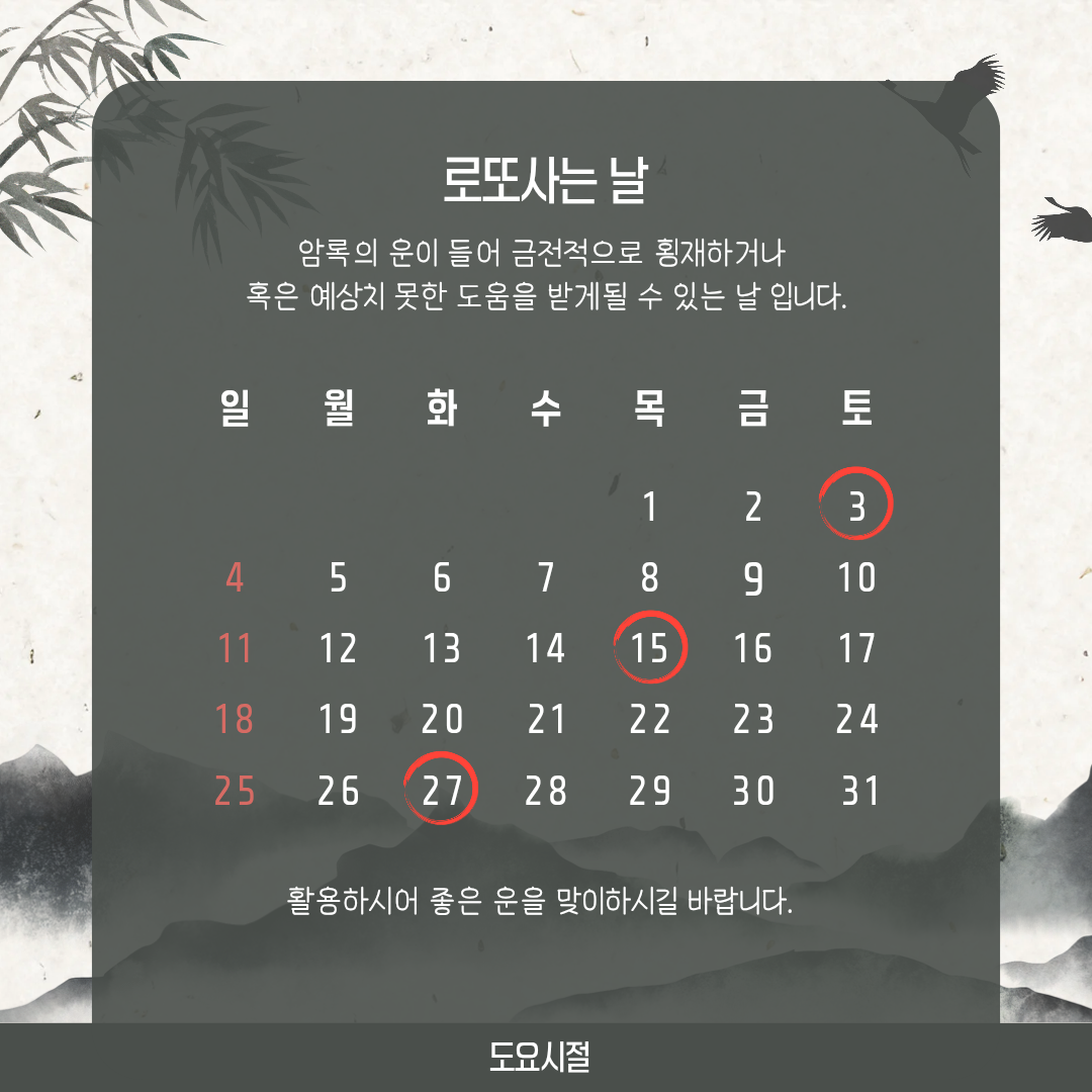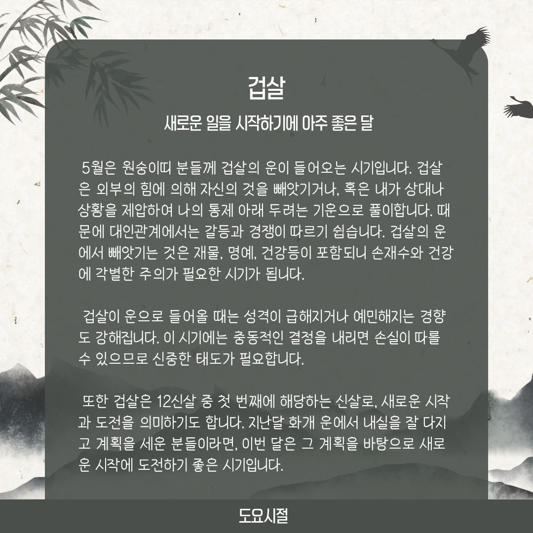 또한 겁살은 12신살 중 첫 번째에 해당하는 신살로, 새로운 시작과 도전을 의미하기도 합니다. 지난달 화개 운에서 내실을 잘 다지고 계획을 세운 분들이라면, 이번 달은 그 계획을 바탕으로 새로운 시작에 도전하기 좋은 시기입니다.